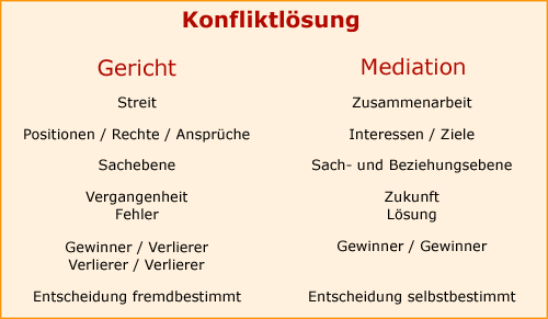 Sehen Sie auch dieses Video, das den Unterschied zwischen Gericht und Mediation erläutert und verdeutlicht: